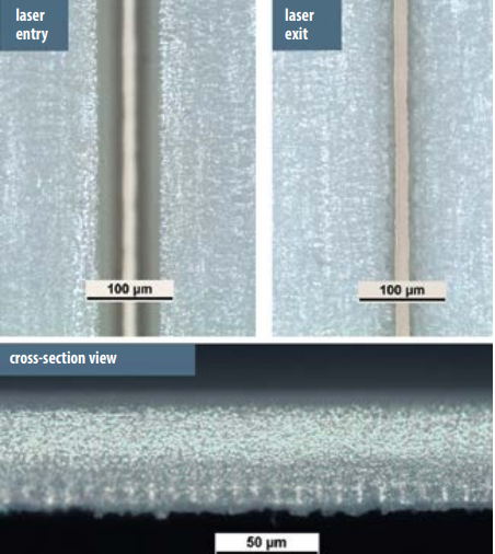 圖1用類星體UV80激光切割50μm厚的裸LCP。入口(左上角)、出口(右上角)和橫截面(底部)視圖顯示了卓越的質量和最小的過度加熱。