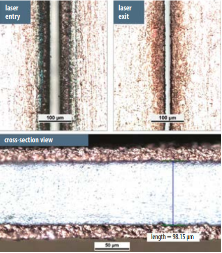 圖2用類星體UV80激光切割的厚覆銅LCP。入口(左上角)、出口(右上角)和橫截面(底部)視圖展示了通過時間定制的ns脈沖實現的干凈、高質量的切割。