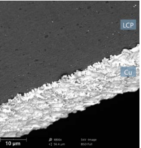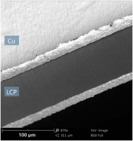特別值得注意的是LCP切割邊緣的光滑度和垂直度,沒有明顯的“桶裝”或從銅鋪管機的切割邊緣拉回。高度放大的界面SEM視圖如圖4所示,并確認LCP和Cu層之間的結合得到了很好的保留。更詳細的細節(jié)還顯示了光滑平坦的LCP表面,沒有任何從切割銅邊緣拉回的痕跡。