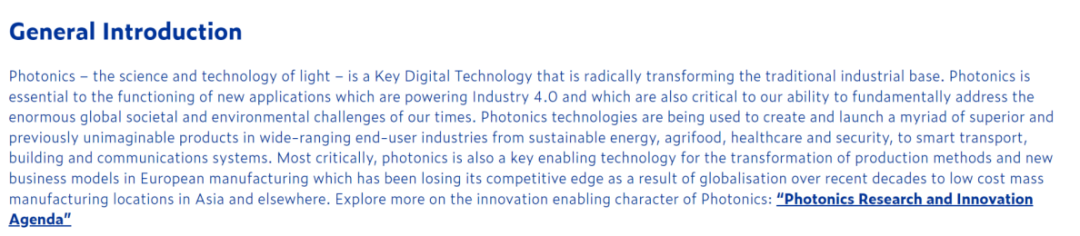 ●歐洲方面:早在2007年1月,歐美啟動第七個科技框架計劃,簡稱“FP7”,總預算為505.21億歐元。而光子學作為歐盟確定的六大關鍵勢能技術之一,“FP7”和“地平線2020”都將光子學技術重點投資領域,創(chuàng)新項目主要包括以下六個領域:新一代光子學技術、高速光纖因特網(wǎng)技術的研究開發(fā)、基于光子學技術的工業(yè)先進制造系統(tǒng)、高效激光加工工藝的開發(fā)、基于光子學技術的環(huán)境保護裝置、基于光子學技術在衛(wèi)生健康領域的應用、基于光子學感應技術在各領域的廣泛應用。