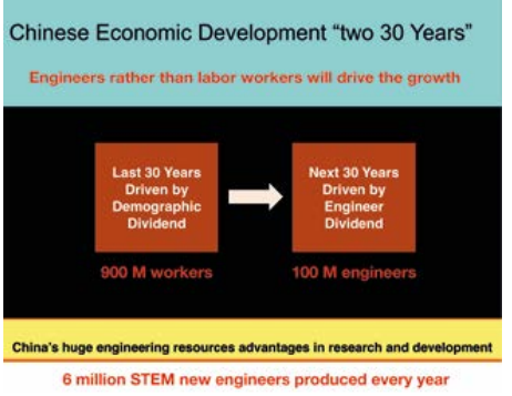 圖2中國經(jīng)濟(jì)發(fā)展的兩個(gè)30年周期。第一個(gè)時(shí)期(1981 - 2011年)是由9億低成本勞動(dòng)力的人口紅利驅(qū)動(dòng)的。下一個(gè)時(shí)期(2011 - 2041)是由1億技術(shù)人員和工程師的工程師紅利驅(qū)動(dòng)的,中國繼續(xù)每年產(chǎn)生600萬工程師。
