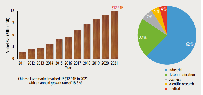 中國激光市場(chǎng)是世界上最大的工業(yè)激光市場(chǎng)。回顧2020年,中國激光產(chǎn)業(yè)全年實(shí)現(xiàn)了10個(gè)百分點(diǎn)的正增長,遠(yuǎn)遠(yuǎn)超出預(yù)期,2021中國激光產(chǎn)業(yè)繼續(xù)保持增長趨勢(shì)。2021,該國激光設(shè)備市場(chǎng)的總體規(guī)模同比增長18.3%,達(dá)到創(chuàng)紀(jì)錄的129億美元(圖3)。在中國從舊的低技術(shù)產(chǎn)業(yè)向新的高技術(shù)產(chǎn)業(yè)轉(zhuǎn)型的過程中,激光技術(shù)的應(yīng)用已成為許多制造業(yè)提高產(chǎn)品質(zhì)量、降低成本、最終提高競爭力的關(guān)鍵。