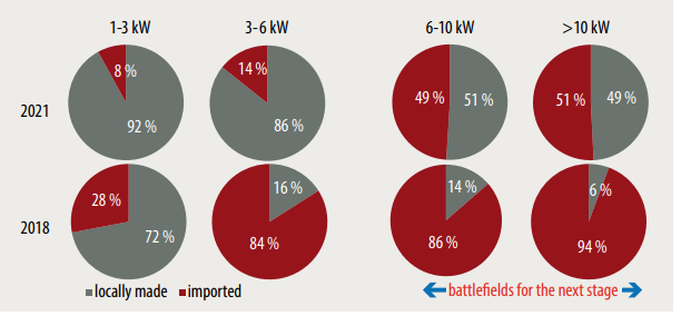 圖4 2018年與2021中國高功率光纖激光器國產(chǎn)化趨勢(shì)。