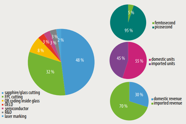 在半導(dǎo)體、顯示器制造和玻璃加工需求的推動(dòng)下,中國的超快激光市場(chǎng)正在快速增長。2021,超過45家制造商在中國共售出2400臺(tái)激光器。銷售的超快激光器中95%是皮秒激光器。飛秒激光只占據(jù)了很小的市場(chǎng)份額。國產(chǎn)激光器占總銷量的55%,但僅占總收入的30%,這表明國產(chǎn)超快激光器的功率水平較低,大多在10至50瓦之間,而進(jìn)口激光器則用于更高功率的應(yīng)用。