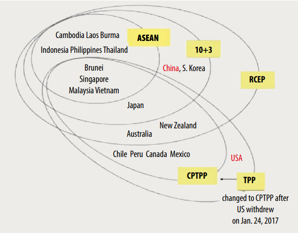圖6亞洲區(qū)域經(jīng)濟(jì)一體化——RCEP(區(qū)域全面經(jīng)濟(jì)伙伴關(guān)系,11個(gè)國家)和CPTPP(跨太平洋伙伴關(guān)系全面漸進(jìn)協(xié)議,15個(gè)國家)。