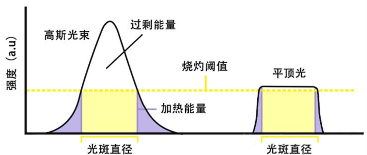 與高斯激光束相比,平頂激光束能更有效地利用能量。在高斯光束輪廓中,中間高于應(yīng)用要求的強(qiáng)度閾值的過剩能量和兩翼中低于閾值要求的能量,都被浪費(fèi)掉了。平頂光束輪廓中沒有兩翼,但具有較陡的邊緣過渡,因此能量利用效率更高,并且對周圍區(qū)域的損傷也會減少。