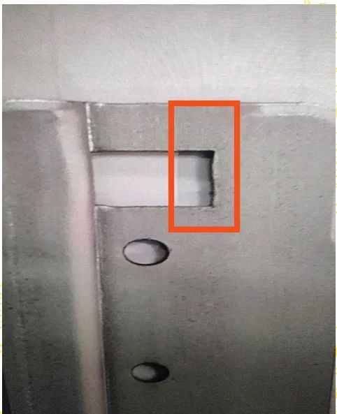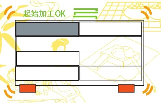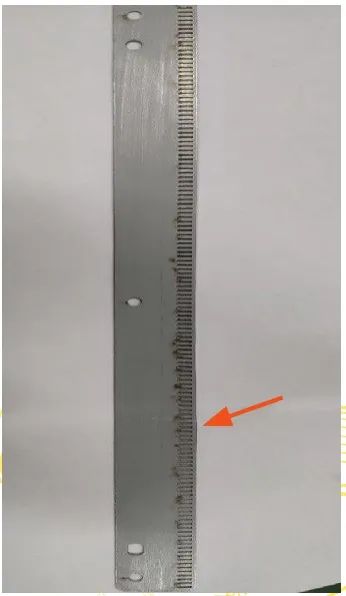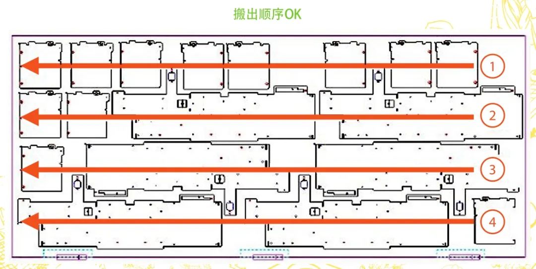 生產(chǎn)過程中,有時(shí)會使用TK機(jī)械手輔助取出切割完成的制品,這樣能更好地節(jié)約人力物力,實(shí)現(xiàn)設(shè)備的全自動化生產(chǎn)。但是在使用TK機(jī)械手取出制品時(shí)需要注意,要控制好制品的取出順序,避免板材因強(qiáng)度減弱、材料晃動產(chǎn)生切割波紋。如果先選擇將板材兩端制品取出,再將板材中間的制品取出,這樣就會造成板材兩端的應(yīng)力被釋放,板材強(qiáng)度不足,當(dāng)加工程序進(jìn)行到板材中間位置時(shí),板材勢必會因強(qiáng)度不足而產(chǎn)生晃動,造成制品的切割波紋,如圖9所示,且產(chǎn)品不良率較高,加工損失較大。如果從遠(yuǎn)離夾鉗一側(cè)將制品依次取出,這樣可以很好地保證加工位置板材應(yīng)力集中,運(yùn)動穩(wěn)定,避免產(chǎn)生切割波紋,如圖10所示。因此在加工編程時(shí),要保證被取出的制品從遠(yuǎn)離夾鉗一端依次進(jìn)行,這樣可以很好地保證板材強(qiáng)度,避免板材在運(yùn)動過程中因強(qiáng)度不足而產(chǎn)生晃動,從而避免切割波紋的產(chǎn)生。