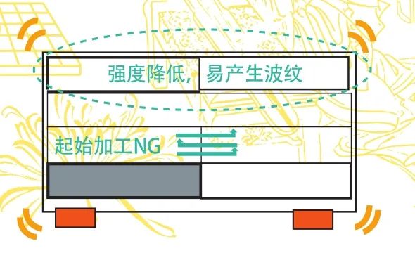 采用復(fù)合機(jī)進(jìn)行鈑金激光切割下料時(shí),機(jī)床夾鉗夾持板材沿X方向和Y方向移動,制品加工設(shè)備及加工區(qū)域如圖1所示。但隨著加工的不斷進(jìn)行,板材局部應(yīng)力被釋放,強(qiáng)度逐漸減弱,導(dǎo)致板材在運(yùn)動過程中產(chǎn)生晃動,從而產(chǎn)生激光切割波紋,造成加工制品不良。而切割波紋的大小還與制品的加工方向、初始加工位置、制品取出順序等因素有關(guān),不同情況的切割波紋不良現(xiàn)象如圖2、圖3所示。且大尺寸制品由于從板材上切割開后,板材的應(yīng)力釋放會較大,因此在切割板材剩余部分時(shí),板材隨夾鉗移動,晃動就會更大,造成切割剩余制品時(shí)產(chǎn)生切割波紋。由于產(chǎn)品尺寸較大、加工時(shí)間較長,因此造成加工費(fèi)用及材料浪費(fèi)較多,所以盡可能保證板材在切割運(yùn)動過程中的受力穩(wěn)定及受力強(qiáng)度是切割下料過程中需要重點(diǎn)考慮的問題。