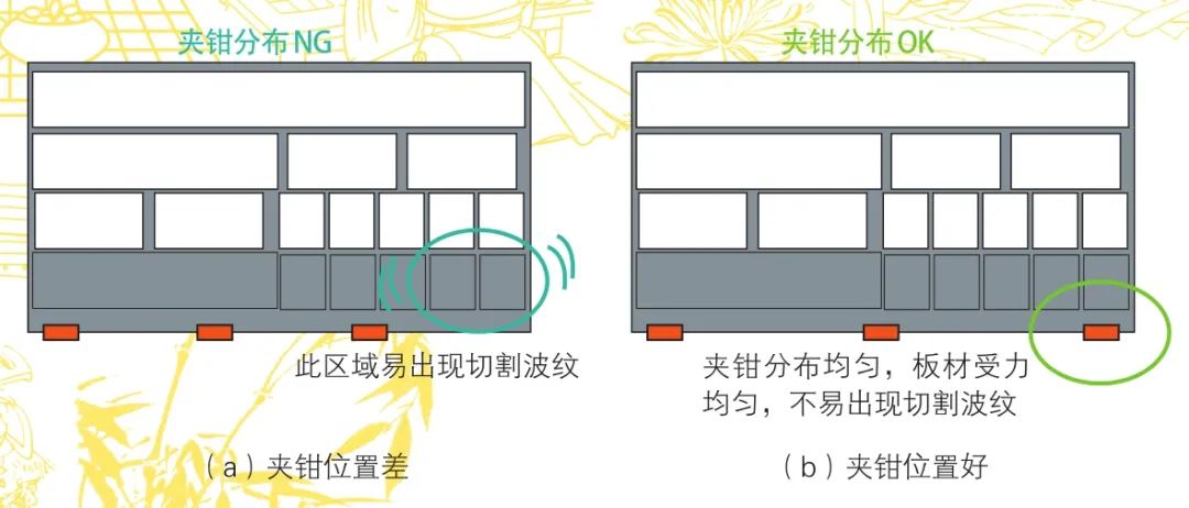 夾鉗的作用,其一就是夾持板材隨著加工程序進(jìn)行X、Y方向的運(yùn)動,其二就是保證板材在加工運(yùn)行過程中的穩(wěn)定性。因此,要合理分布夾鉗夾持板材的位置,做到夾鉗分布均勻,避免夾鉗偏向一側(cè)導(dǎo)致板材不穩(wěn)定產(chǎn)生晃動,導(dǎo)致切割波紋的產(chǎn)生。夾鉗夾持位置對比如圖8所示,此因素對切割波紋雖有一定影響,但屬于操作過程中可避免的影響因素。