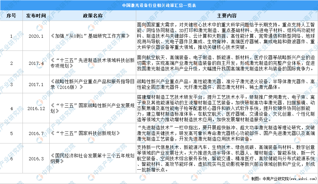 激光加工技術(shù)是我國(guó)重點(diǎn)支持發(fā)展的領(lǐng)域,作為現(xiàn)代制造業(yè)的支持性產(chǎn)業(yè),在國(guó)民經(jīng)濟(jì)發(fā)展過程中扮演著重要角色。國(guó)家為扶持激光加工技術(shù)的發(fā)展,制定了多項(xiàng)政策及法律法規(guī)。為規(guī)范激光行業(yè)的競(jìng)爭(zhēng)秩序,加強(qiáng)對(duì)激光行業(yè)相關(guān)知識(shí)產(chǎn)權(quán)的保護(hù)力度,促進(jìn)激光技術(shù)的發(fā)展創(chuàng)造了有利的環(huán)境。國(guó)家政策的落地實(shí)施為激光技術(shù)及激光制造的發(fā)展提供了保障,有力促進(jìn)激光設(shè)備行業(yè)的可持續(xù)發(fā)展。