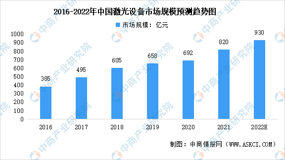 隨著國(guó)民經(jīng)濟(jì)的發(fā)展和人民生活水平的持續(xù)提高,半導(dǎo)體、顯示面板、消費(fèi)電子、新能源汽車等下游應(yīng)用的需求日益旺盛,這一部分業(yè)務(wù)將助力我國(guó)激光設(shè)備市場(chǎng)實(shí)現(xiàn)快速增長(zhǎng)。數(shù)據(jù)顯示,我國(guó)激光設(shè)備市場(chǎng)規(guī)模由2016年的385億元增長(zhǎng)至2020年的692億元,復(fù)合年均增長(zhǎng)率為15.9%。中商產(chǎn)業(yè)研究院預(yù)測(cè),2022年我國(guó)激光設(shè)備市場(chǎng)規(guī)模將達(dá)930億元。
