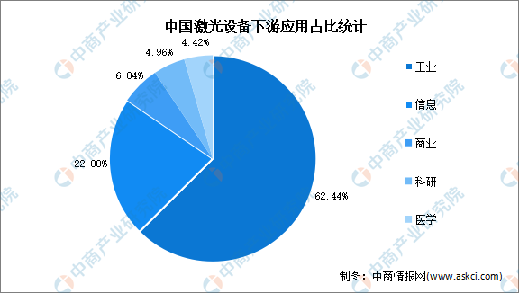 從下游應(yīng)用來看,我國(guó)作為全球最大的制造業(yè)國(guó)家,激光設(shè)備目前主要應(yīng)用于工業(yè)生產(chǎn)之中。2020年,工業(yè)領(lǐng)域激光設(shè)備市場(chǎng)規(guī)模為432.1億元,占總市場(chǎng)規(guī)模的比重為62.44%;信息領(lǐng)域激光設(shè)備市場(chǎng)規(guī)模為152.2億元,占比為22%;商業(yè)、科研和醫(yī)用激光設(shè)備占比則均未超過10%,分別以41.8億元、34.3億元和30.6億元位列三、四、五位。預(yù)計(jì)2022年我國(guó)激光設(shè)備市場(chǎng)規(guī)模還將繼續(xù)增長(zhǎng),其中工業(yè)用激光設(shè)備依舊是最為主要的增長(zhǎng)點(diǎn)。