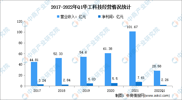 華工科技產(chǎn)業(yè)股份有限公司1999年成立于“中國(guó)光谷”腹地,2000年在深圳交易所上市,是集“研發(fā)、生產(chǎn)、銷售、服務(wù)”為一體的高科技企業(yè)集團(tuán),2015年評(píng)定為國(guó)家級(jí)創(chuàng)新型企業(yè)。經(jīng)過多年的技術(shù)、產(chǎn)品積淀,形成了以激光加工技術(shù)為重要支撐的智能制造裝備業(yè)務(wù)、以信息通信技術(shù)為重要支撐的光聯(lián)接、無線聯(lián)接業(yè)務(wù),以敏感電子技術(shù)為重要支撐的傳感器以及激光防偽包裝業(yè)務(wù)三大業(yè)務(wù)格局。2021年,華工科技營(yíng)業(yè)收入達(dá)101.67億元,實(shí)現(xiàn)凈利潤(rùn)7.61億元,同比增長(zhǎng)38.24%。2022年第一季度,華工科技實(shí)現(xiàn)營(yíng)業(yè)收入28.58億元,實(shí)現(xiàn)凈利潤(rùn)2.26億元。