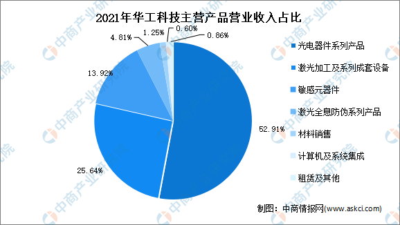 分產(chǎn)品來看,2021年華工科技主營(yíng)業(yè)務(wù)有光電器件系列產(chǎn)品、激光加工及系列成套設(shè)備、敏感元器件、激光全息防偽系列產(chǎn)品、材料銷售、計(jì)算機(jī)及系統(tǒng)集成、租賃及其他,其營(yíng)業(yè)收入分別占主營(yíng)業(yè)務(wù)收入的52.91%、25.64%、13.92%、4.81%、1.25%、0.60%、0.86%。