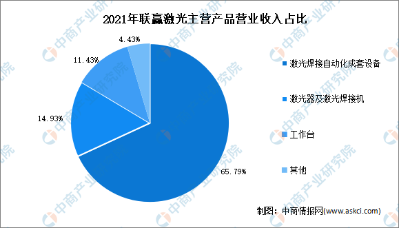 分產(chǎn)品來看,2021年聯(lián)贏激光主營(yíng)激光焊接自動(dòng)化成套設(shè)備、激光器及激光焊接機(jī)、工作臺(tái),其營(yíng)業(yè)收入分別占主營(yíng)業(yè)務(wù)收入的65.79%、14.93%、11.43%。